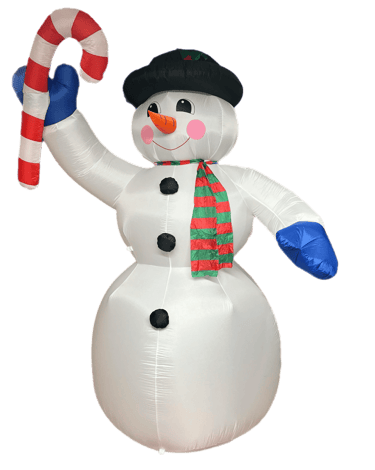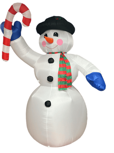 Styled after classic designs from the golden age of holiday inflatables, this remake features a jolly snowman with rosy cheeks, vibrant blue mittens, a festive red-and-green scarf, and a vintage black top hat with holly detail. His oversized candy cane adds a cheerful touch, perfect for lighting up any yard with classic